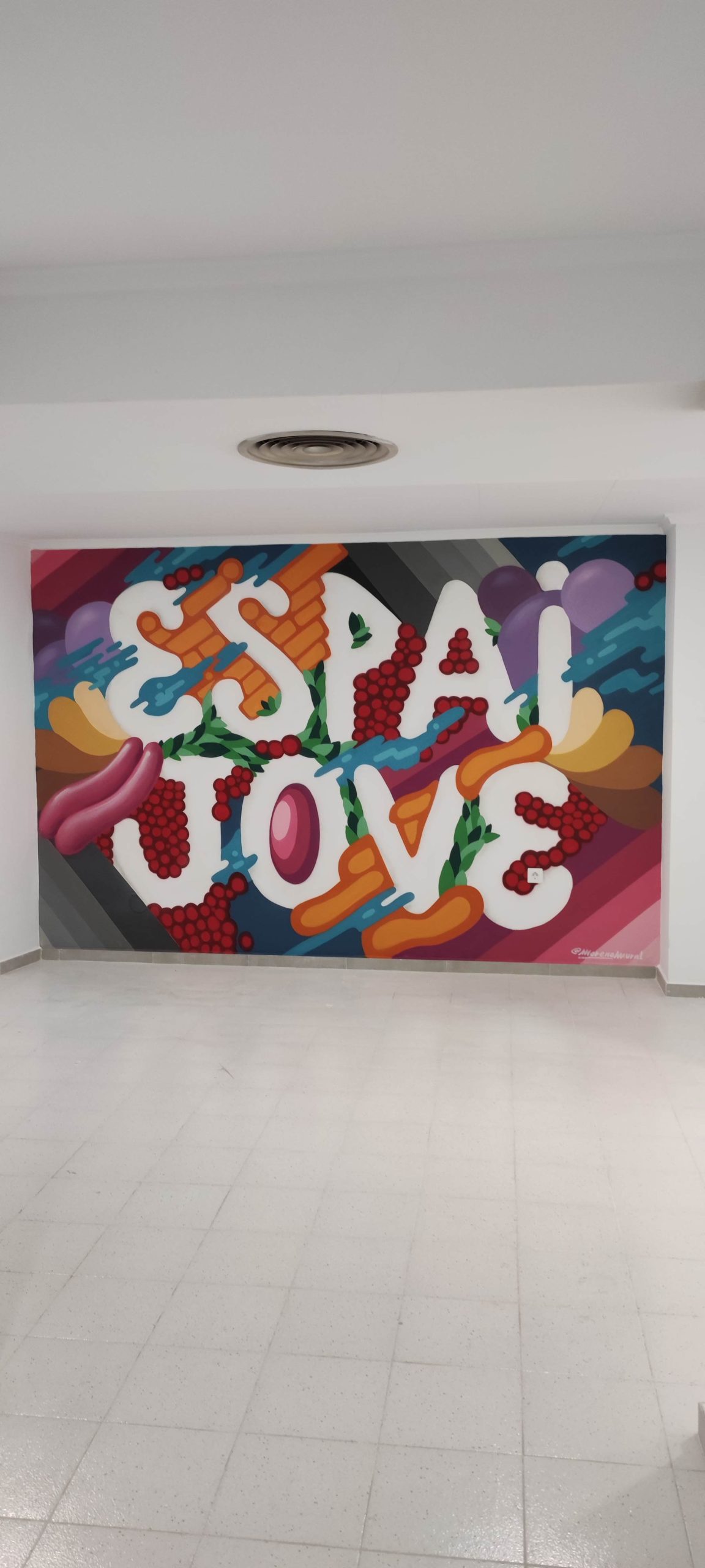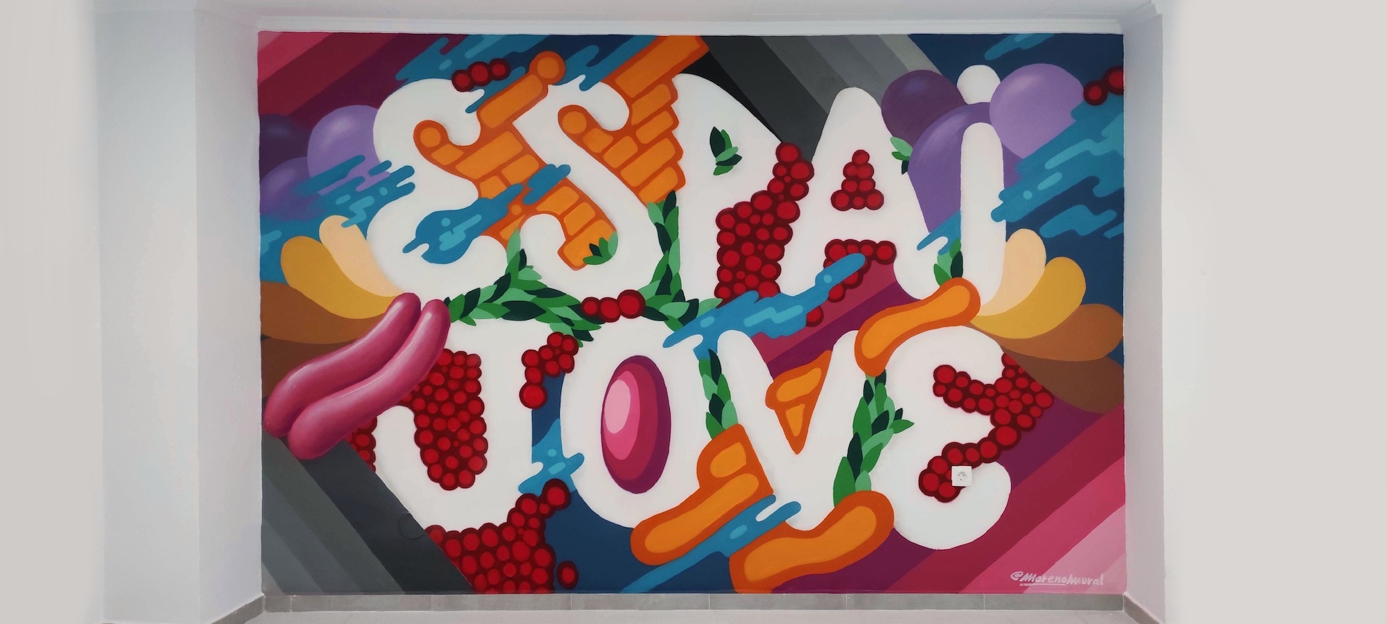 Se me encargó un letrero para el hall de entrada que rompiera en cierta medida con el entorno blanco de las instalaciones, para ello se me propusieron algunos referentes de artistas que construyen las letras a base de diferentes texturas como por ejemplo BoaMixtura. A partir de ahí trabajé esta tipografía plana dentro de un entorno de formas con colores saturados en un espacio onírico.